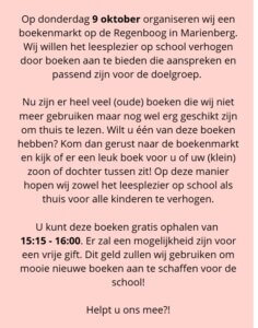 Donderdag 9 oktober van 15:15 – 16:00 hebben we op school een boekenmarkt.